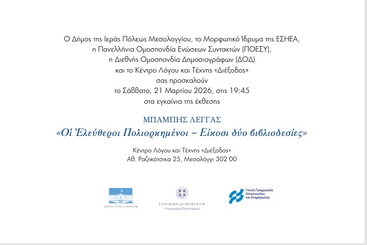 Τρίτον, σε συνδιοργάνωση του Μορφωτικού Ιδρύματος της ΕΣΗΕΑ και του Κέντρου Λόγου και Τέχνης «Διέξοδος» θα λειτουργήσει έκθεση με τίτλο «Οι Ελεύθεροι Πολιορκημένοι», στην οποία θα παρουσιαστούν είκοσι δύο πρωτότυπες, καλλιτεχνικές βιβλιοδεσίες των «Ελευθέρων Πολιορκημένων» του Διονυσίου Σολωμού –όλα τους έργα του Μπάμπη Λέγγα.